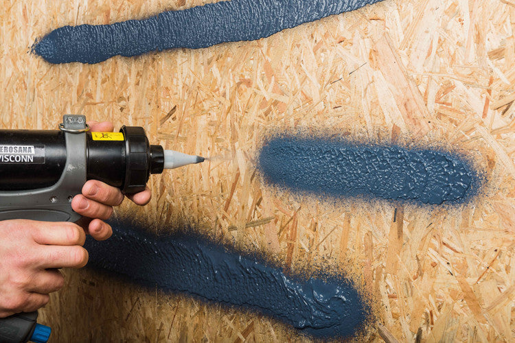 Spray and seal application tool for use with VISCONN® and VISCONN FIBRE® sausages. Connects with standard compressors to quickly and easily apply liquid applied airtight membrane anywhere from wall or ceiling surfaces to hard-to-reach gaps.