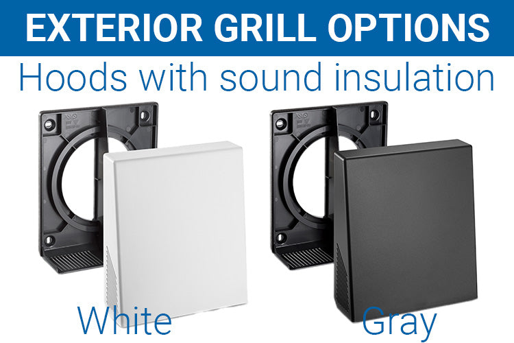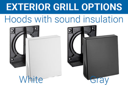 Exterior Grill | There are 3 options for Exterior Grills: (1) Standard White Ext Grill with angled slats to shed rain and includes a bug screen (2) A white aluminum hood or (3) A gray aluminum hood - both aluminum hoods offer durable, long-lasting protection and reduce exterior noise by 6 decibels |